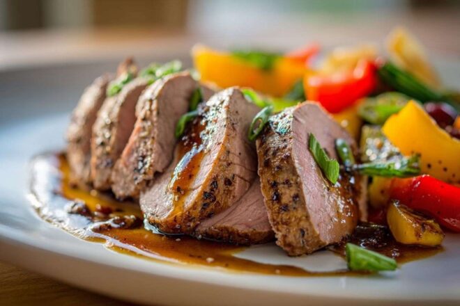 Une assiette élégante présentant de la viande rôtie tranchée, garnie de légumes colorés et nappée de sauce.