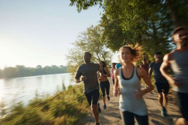 Un groupe de coureurs divers s'adonnant à un jogging détendu le long d'un chemin paisible au bord d'un lac, promouvant la camaraderie.