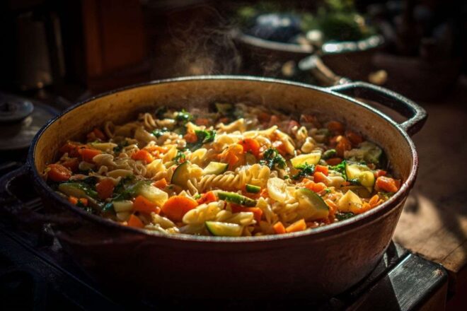 Un plat mijoté vibrant avec des légumes colorés et des pâtes dans une marmite rustique sur une cuisinière.